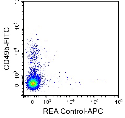 • Staining of C57BL/6 mouse splenic lymphocytes using FITC CD49b Antibody and APC REA Antibody (Clone: REA293) (Catalog Number: H4413). Analysis data derived from live lymphocytes.