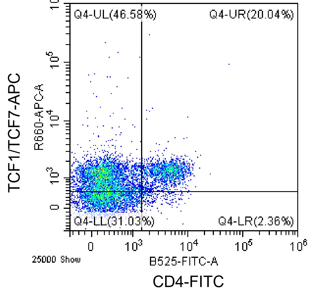 • Surface staining of splenocytes from C57BL/6 mice using FITC CD4 Antibody, followed by staining with APC Anti-TCF1/TCF7 Antibody (Clone: E19C1) (Product No.: G4022) after permeabilization of cells using the Foxp3/Transcription Factor Staining Buffer Set. Analyzed data are derived from total lymphocytes.