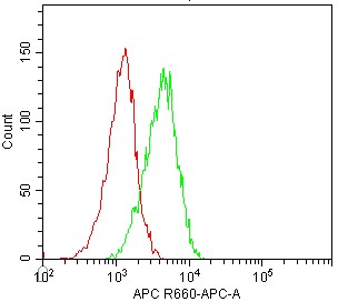• Staining of J774A.1 cell line cells using APC Anti-TLR4/MD-2 Complex Antibody (Clone: MTS510) (Product No.: G3423) (green, red is blank control). Analyzed data are derived from live cells.