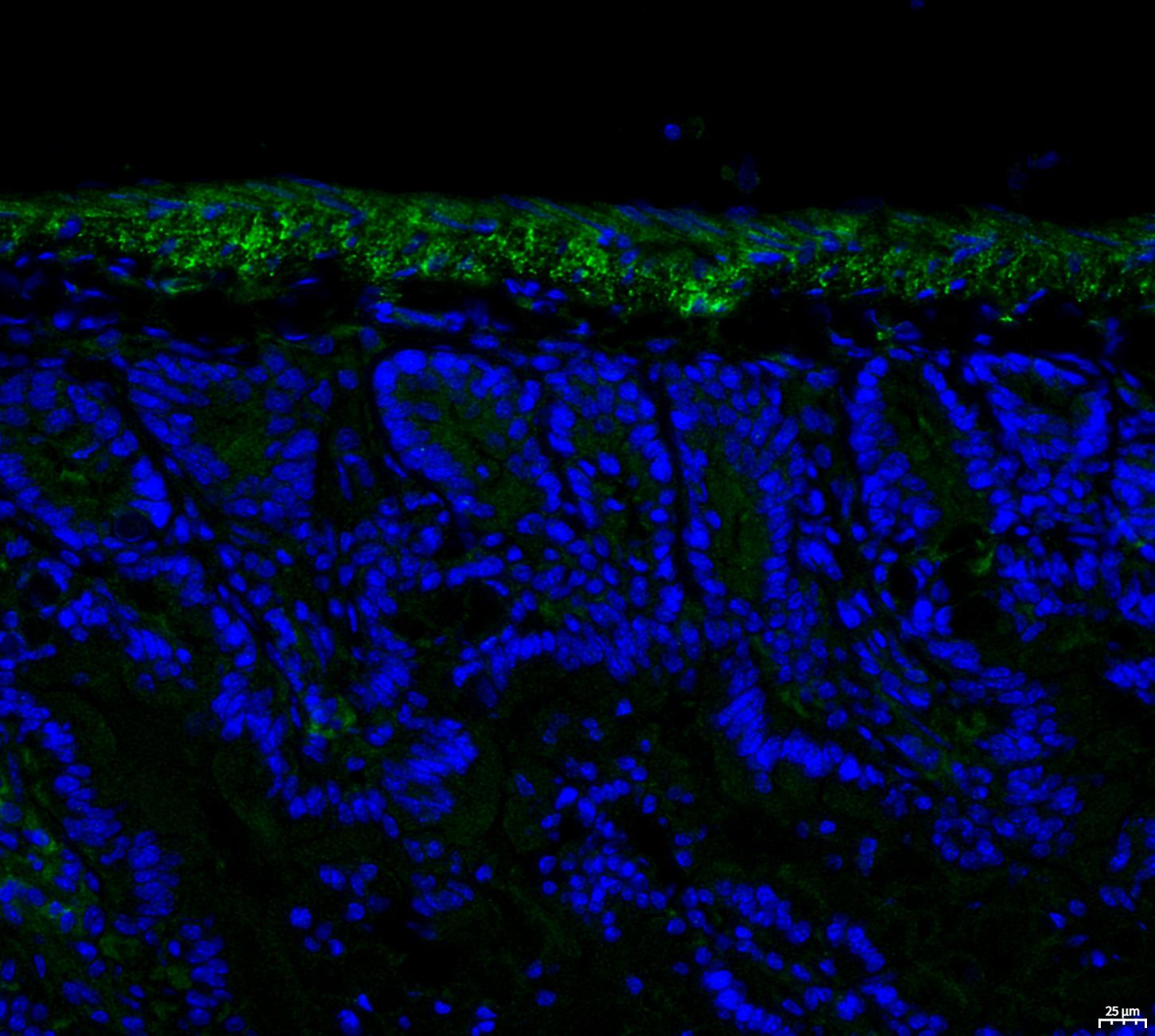 • Immunofluorescent analysis of Mouse duodenum tissue using F3133 (green, 1:50) and Hoechst (blue).