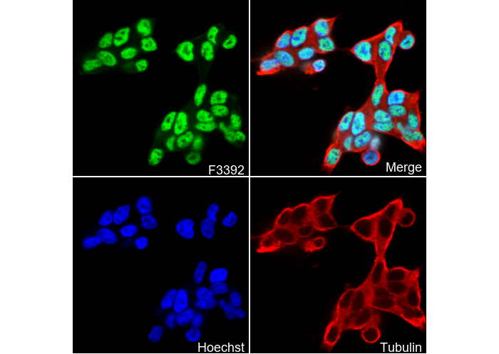 • Immunofluorescent analysis of SH-SY5Y cells using F3392 (green, 1:500), Hoechst (blue) and tubulin (Red).