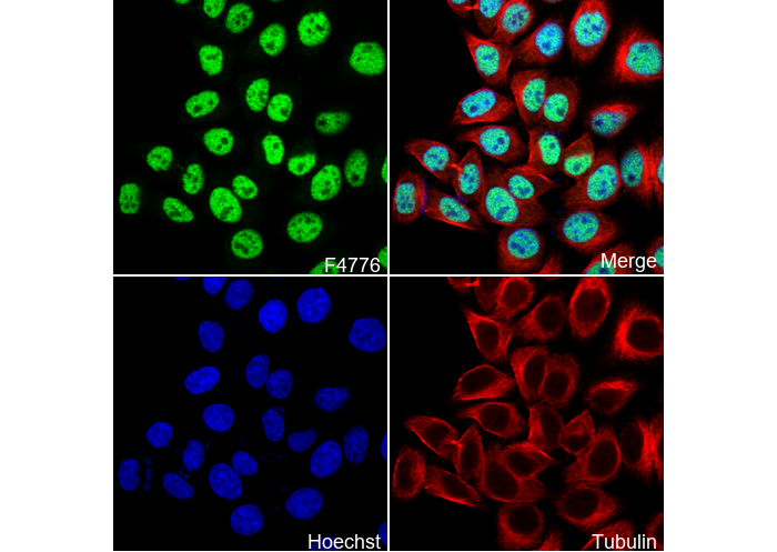 • Immunofluorescent analysis of HepG2 cells using F4776 (green, 1:50), Hoechst (blue) and tubulin (Red).