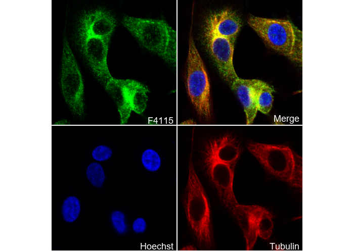 • Immunofluorescent analysis of HT1080 cells using F4115 (green, 1:1600), Hoechst (blue) and tubulin (Red).