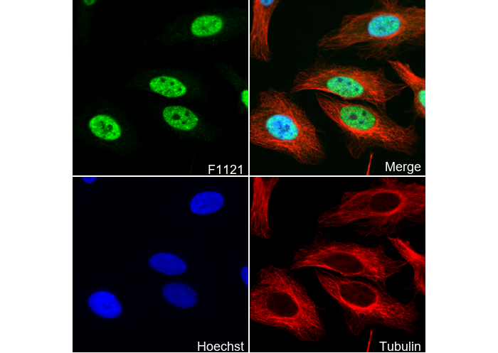 • Immunofluorescent analysis of Hela cells using F1121 (green, 1:100), Hoechst (blue) and tubulin (Red).