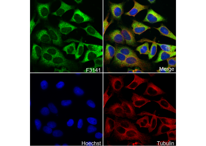 • Immunofluorescent analysis of Hela cells using F3141 (green, 1:100), Hoechst (blue) and tubulin (Red).