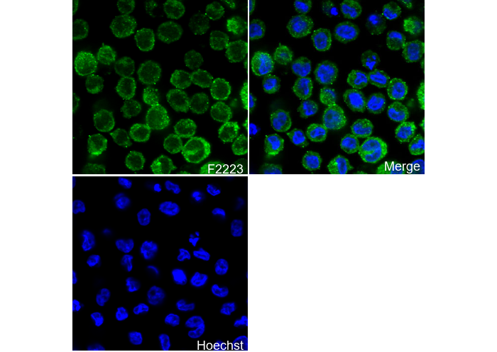 • Immunofluorescent analysis of HL-60 cells using F2223 (green, 1:100), Hoechst (blue) and tubulin (Red).