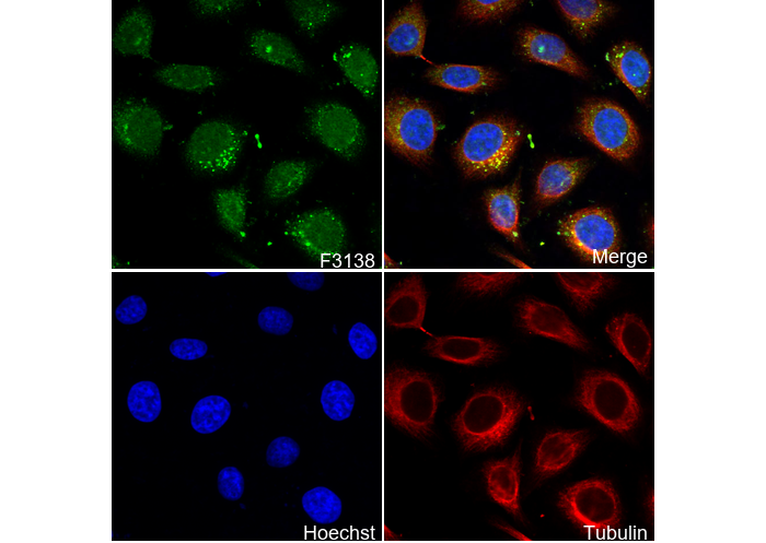 • Immunofluorescent analysis of HepG2 cells using F3138 (green, 1:100), Hoechst (blue) and tubulin (Red).