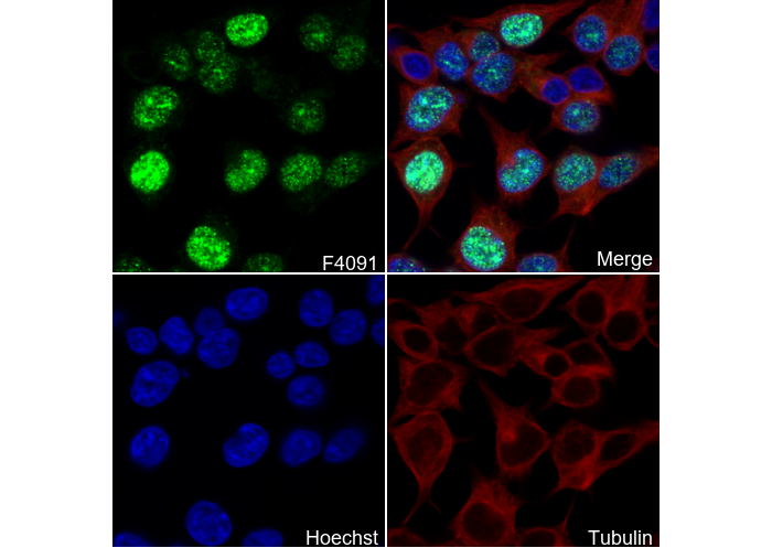 • Immunofluorescent analysis of U-2 OS cells using F4091 (green, 1:800), Hoechst (blue) and tubulin (Red).