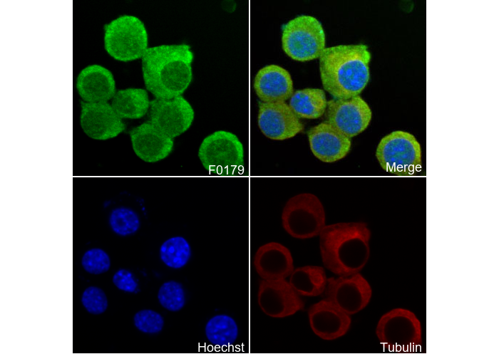 • Immunofluorescent analysis of Neuro-2a cells using F0179 (green, 1:100), Hoechst (blue) and tubulin (Red).