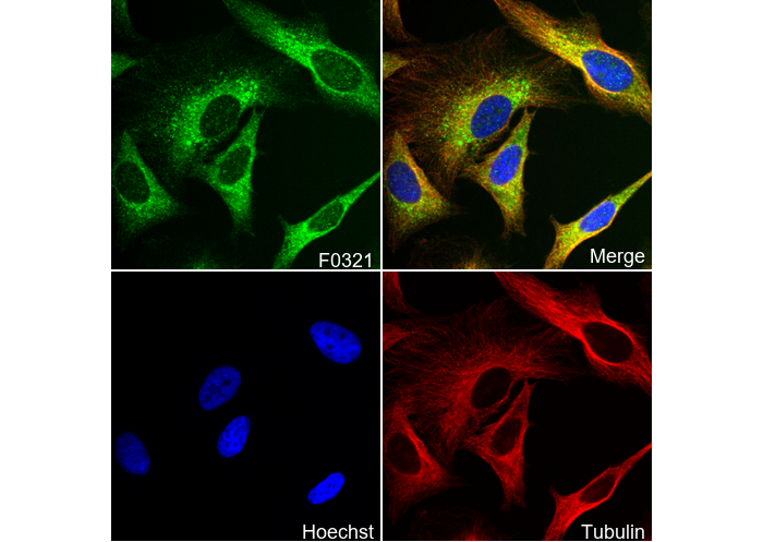 • Immunofluorescent analysis of Hela cells using F0321 (green, 1:100), Hoechst (blue) and tubulin (Red).