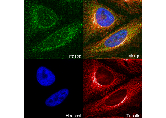 • Immunofluorescent analysis of Hela cells using F0129 (green, 1:200), Hoechst (blue) and tubulin (Red).