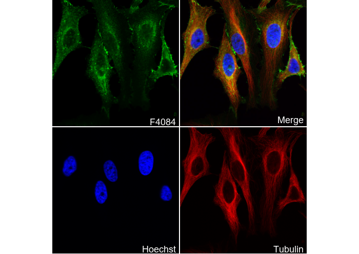 • Immunofluorescent analysis of Hela cells using F4084 (green, 1:100), Hoechst (blue) and tubulin (Red).