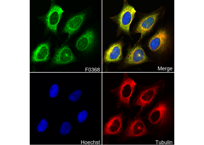 • Immunofluorescent analysis of Hela cells using F0368 (green, 1:200), Hoechst (blue) and tubulin (Red).