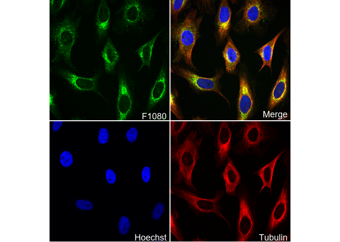 • Immunofluorescent analysis of Hela cells using F1080 (green, 1:900), Hoechst (blue) and tubulin (Red).