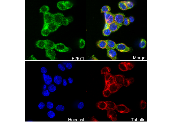 • Immunofluorescent analysis of HT-29 cells using F2971 (green, 1:100), Hoechst (blue) and tubulin (Red).