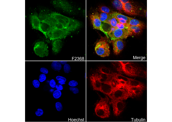 • Immunofluorescent analysis of HUVEC cells using F2368 (green, 1:100), Hoechst (blue) and tubulin (Red).