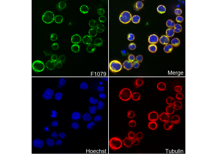 • Immunofluorescent analysis of Jurkat cells using F1079 (green, 1:500), Hoechst (blue) and tubulin (Red).