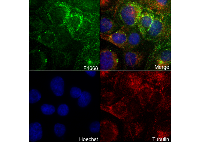 • Immunofluorescent analysis of HUVEC cells using F1668 (green, 1:100000), Hoechst (blue) and tubulin (Red).