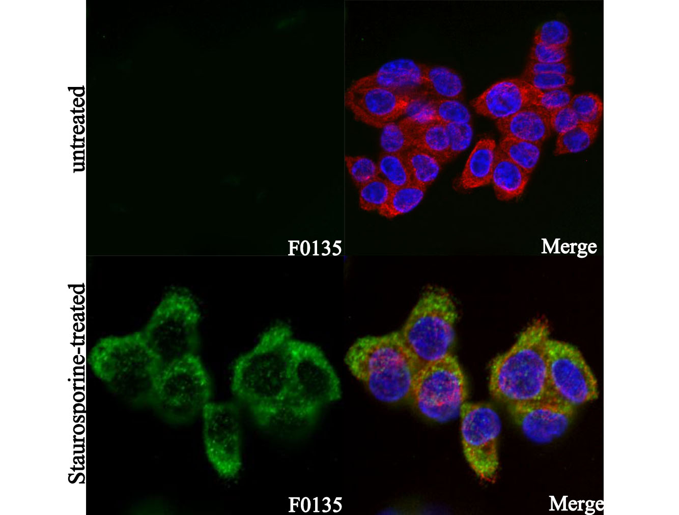 • Immunofluorescent analysis of HT-29 cells, untreated (upper) and staurosporine treated(lower), using F0135 (green, 1:400), Hoechst (blue) and tubulin (Red).