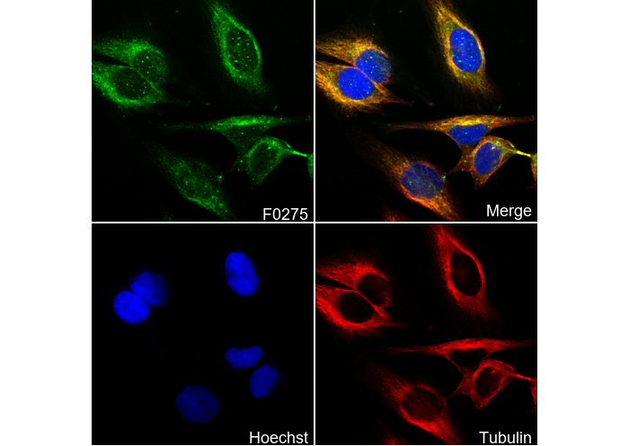 • Immunofluorescent analysis of Hela cells using F0275 (green, 1:1600), Hoechst (blue) and tubulin (Red).