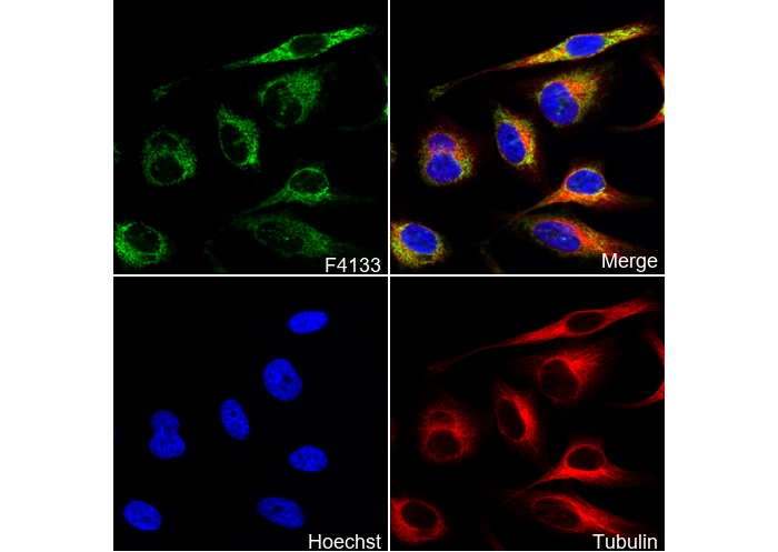 • Immunofluorescent analysis of Hela cells using F4133 (green, 1:200), Hoechst (blue) and tubulin (Red).