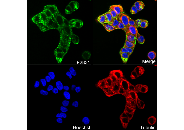 • Immunofluorescent analysis of A431 cells using F2831 (green, 1:100), Hoechst (blue) and tubulin (Red).