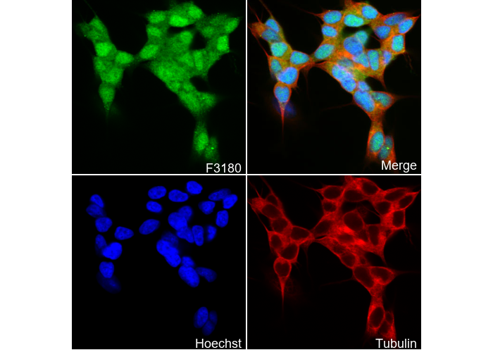 • Immunofluorescent analysis of SH-SY5Y cells using F3180 (green, 1:250), Hoechst (blue) and tubulin (Red).