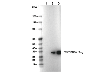 • Lane 1: 293T, Lane 2: 293T (transfected with DYKDDDDK-GFP) (N-terminal DDK-Tag), Lane 3: 293T (transfected with GFP-DYKDDDDK) (C-terminal DDK-Tag)