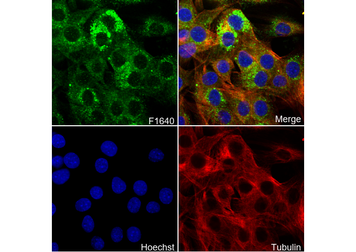 • Immunofluorescent analysis of C2C12 cells using F1640 (green, 1:200), Hoechst (blue) and tubulin (Red).