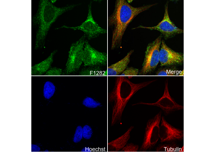 • Immunofluorescent analysis of Hela cells using F1282 (green, 1:200), Hoechst (blue) and tubulin (Red).