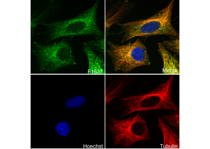• Immunofluorescent analysis of Hela cells using F1637 (green, 1:400), Hoechst (blue) and tubulin (Red).