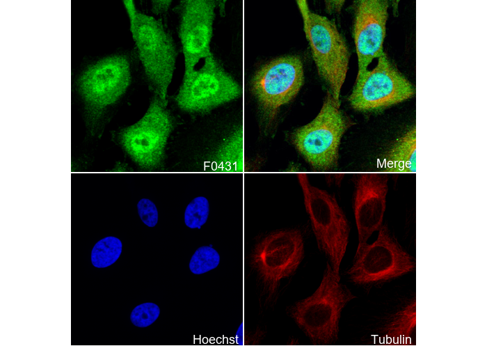 • Immunofluorescent analysis of Hela cells using F0431 (green, 1:50), Hoechst (blue) and tubulin (Red).