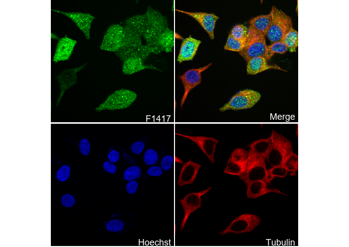 • Immunofluorescent analysis of MCF-7 cells using F1417 (green, 1:800), Hoechst (blue) and tubulin (Red).