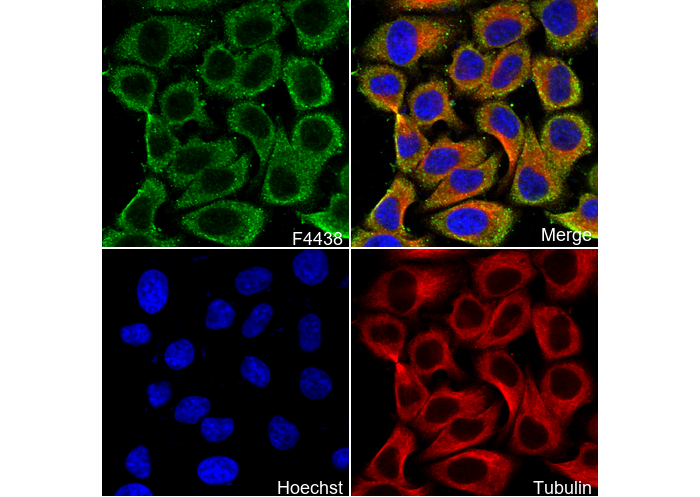 • Immunofluorescent analysis of HepG2 cells using F4438 (green, 1:50), Hoechst (blue) and tubulin (Red).