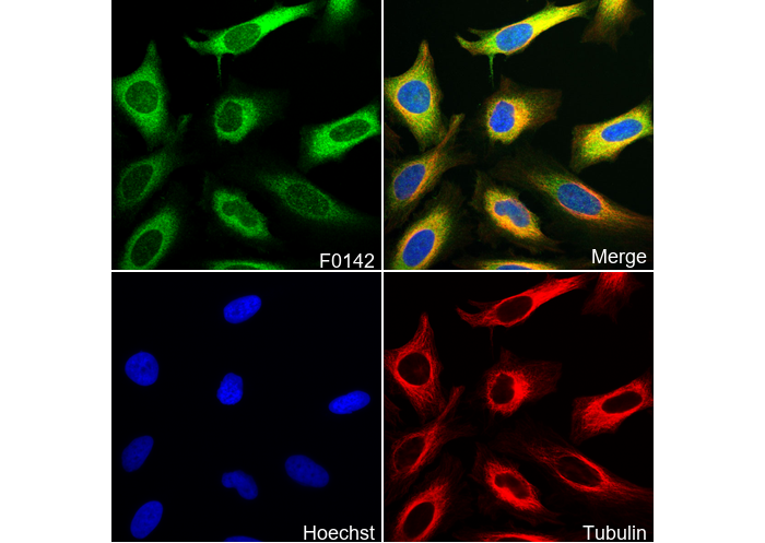• Immunofluorescent analysis of Hela cells using F0142 (green, 1:200), Hoechst (blue) and tubulin (Red).