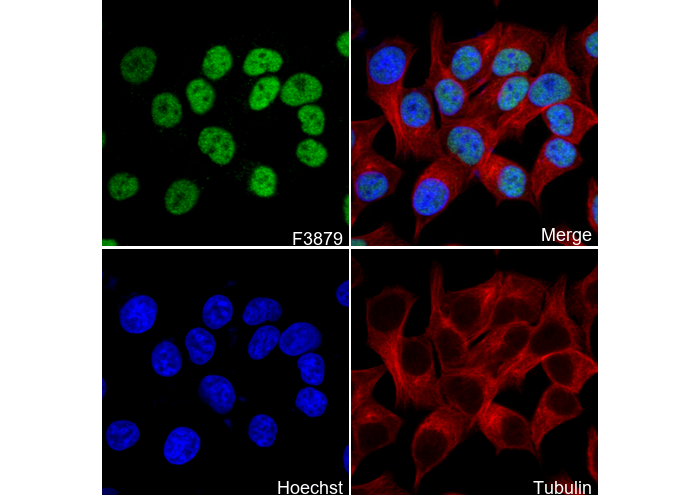• Immunofluorescent analysis of MCF-7 cells using F3879 (green, 1:50), Hoechst (blue) and tubulin (Red).