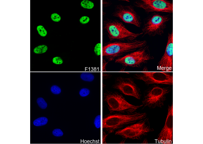 • Immunofluorescent analysis of Hela cells using F1381 (green, 1:200), Hoechst (blue) and tubulin (Red).