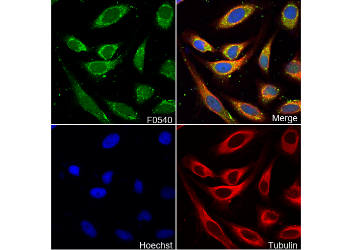• Immunofluorescent analysis of Hela cells using F0540 (green, 1:20), Hoechst (blue) and tubulin (Red).