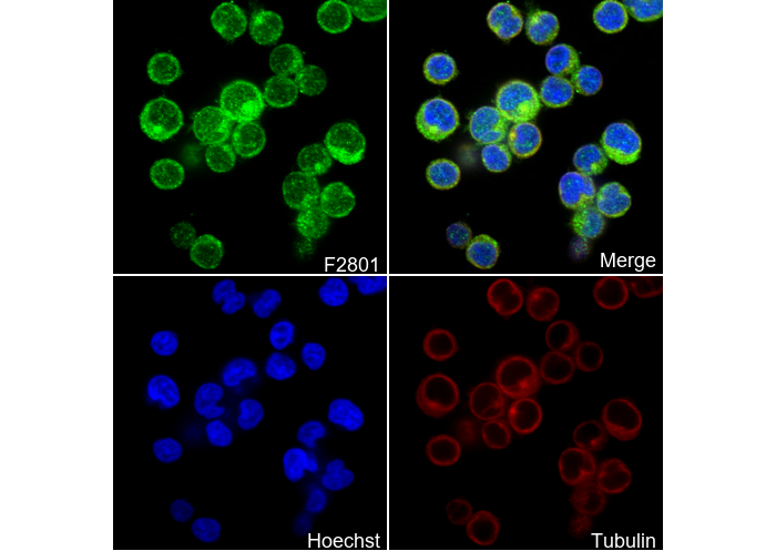 • Immunofluorescent analysis of Jurkat cells using F2801 (green, 1:250), Hoechst (blue) and tubulin (Red).