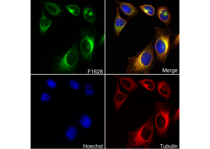 • Immunofluorescent analysis of Hela cells using F1628 (green, 1:250), Hoechst (blue) and tubulin (Red).