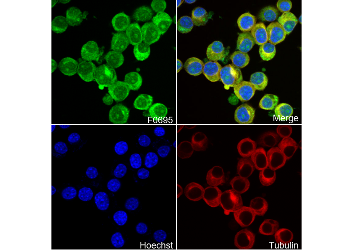 • Immunofluorescent analysis of Neuro-2a cells using F0695 (green, 1:200), Hoechst (blue) and tubulin (Red).
