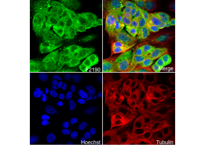 • Immunofluorescent analysis of PC12 cells using F2190 (green, 1:200), Hoechst (blue) and tubulin (Red).