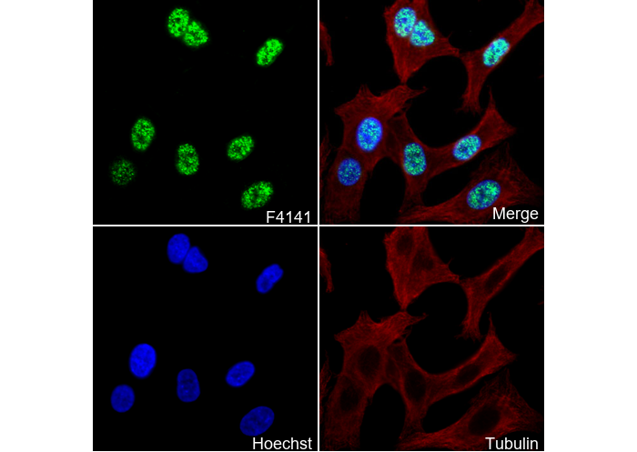 • Immunofluorescent analysis of A549 cells using F4141 (green, 1:200), Hoechst (blue) and tubulin (Red).
