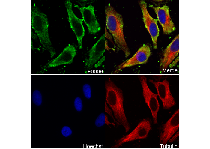 • Immunofluorescent analysis of Hela cells using F0009 (green, 1:100), Hoechst (blue) and tubulin (Red).