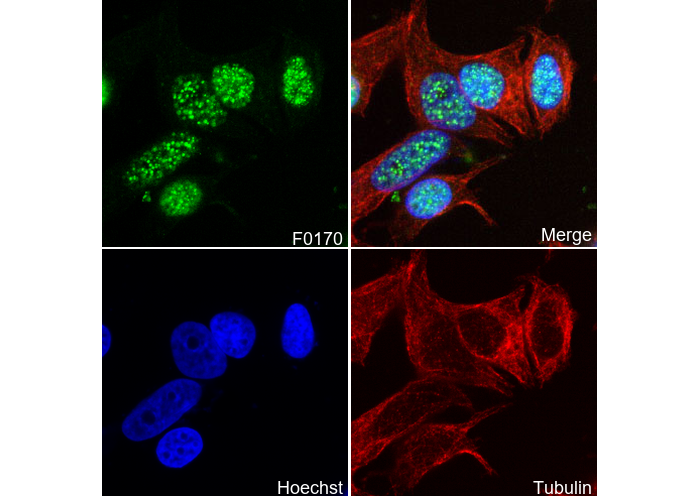 • Immunofluorescent analysis of MCF-7 cells using F0170 (green, 1:400), Hoechst (blue) and tubulin (Red).