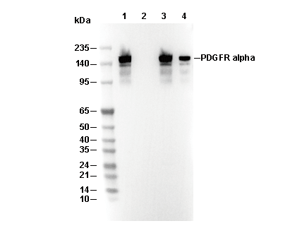 • Lane 1: SH-SY5Y, Lane 2: SH-SY5Y (KO PDGFRA), Lane 3: C6, Lane 4: NIH/3T3