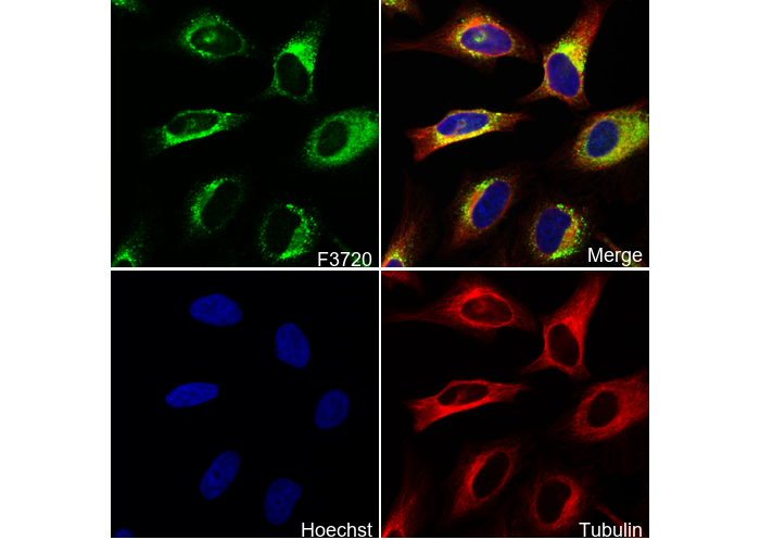 • Immunofluorescent analysis of Hela cells using F3720 (green, 1:100), Hoechst (blue) and tubulin (Red).