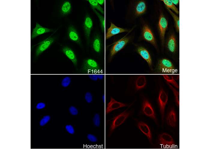 • Immunofluorescent analysis of Hela cells using F1644 (green, 1:100), Hoechst (blue) and tubulin (Red).