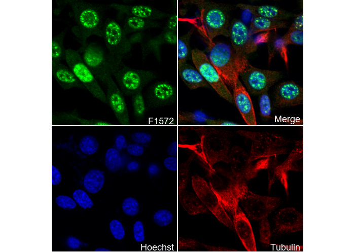 • Immunofluorescent analysis of NIH/3T3 cells using F1572 (green, 1:50), Hoechst (blue) and tubulin (Red).