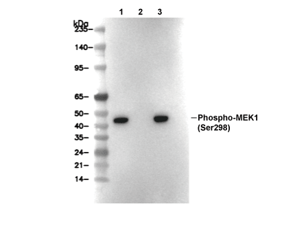 Phospho-MEK1 (Ser298) 仅识别 Ser298 处磷酸化的内源性 MEK1 蛋白水平。